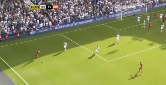 The ball doesn’t travel too far, and Brunt heads intelligently back into the box, where Spurs have not picked up their men. Walker hasn’t tracked Morrison at all, and a number of players are sucked towards the ball. West Brom have three players unmarked in dangerous areas.